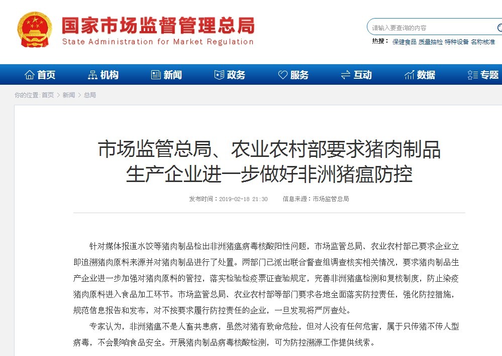 最近的"非洲猪瘟"事件受到政府相关部门关注。2月18日晚,国家市场监管总局、农业农村部联合下发《要求猪肉制品生产企业进一步做好非洲猪瘟防控进一步做好非洲猪瘟防控》的公告,表示已派出联合督查组调查核实相关情况,要求猪肉制品生产企业进一步加强对猪肉原料的管控,落实检验检疫票证查验规定,完善非洲猪瘟检测和复核制度,防止染疫猪肉原料进入食品加工环节。同时,要求各地全面落实防控责任,规范信息报告和发布,对不按要求履行防控责任的企业,一旦发现将严厉查处。