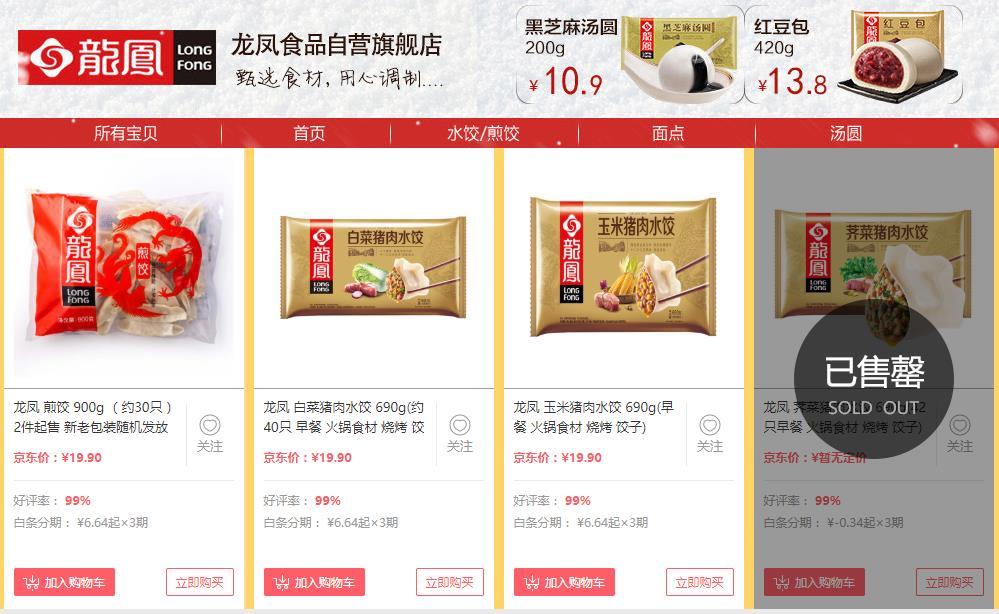 新京报记者2月19日晚查询发现,龙凤食品京东自营店、天猫易果生鲜旗舰店仍有龙凤荠菜猪肉水饺出售,苏宁超市则搜索不到该产品。不过到2月20日上午,天猫平台已搜索不到龙凤荠菜猪肉水饺和龙凤水饺,龙凤食品京东自营旗舰店内龙凤荠菜猪肉水饺已下架。