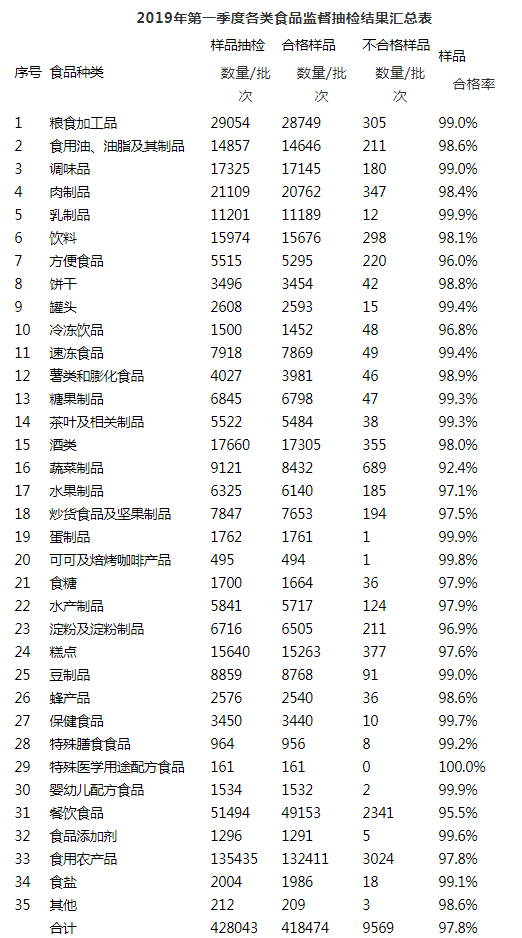 2019年第一季度,全国市场监管系统共完成并公布428043批次食品(含保健食品和食品添加剂)样品监督抽检结果,检验项目全部合格的418474批次,不合格的9569批次,总体不合格率为2.2%,比2018年同期下降0.4个百分点。